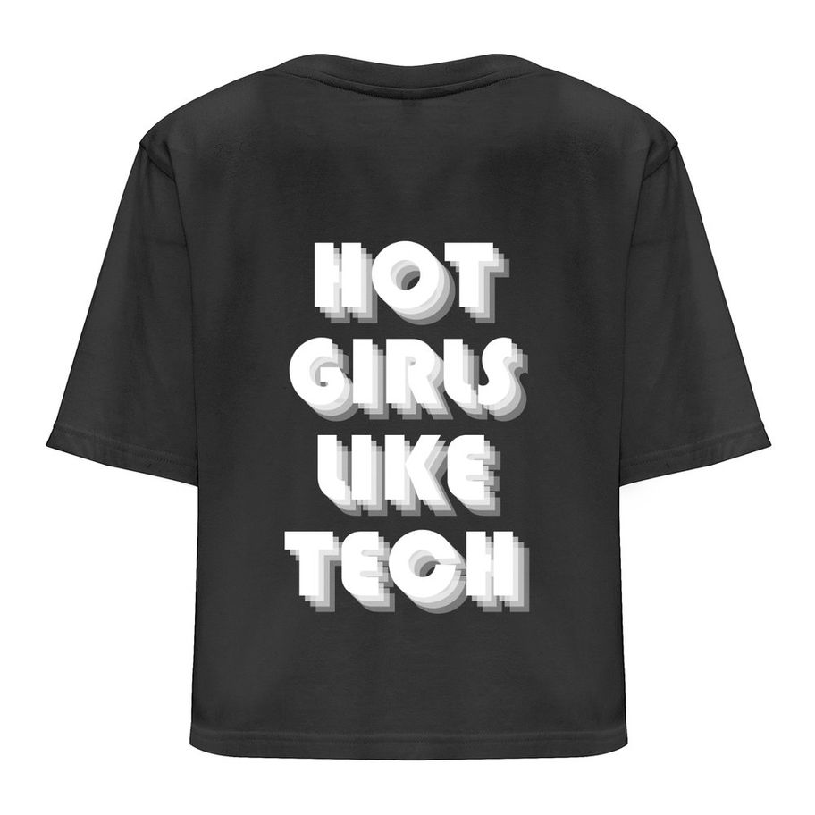 Black modern-cut crop top with back print: HOT GIRLS LIKE TECH